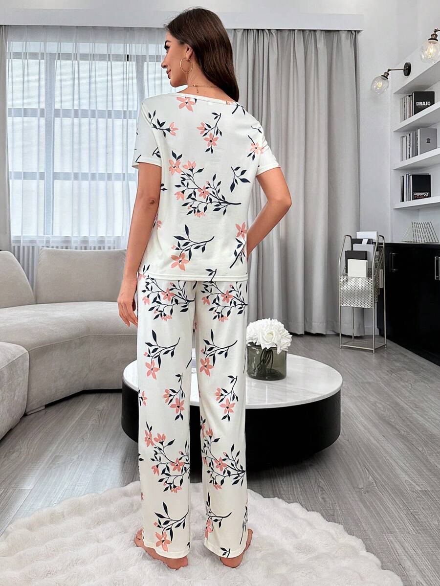 Ensemble pyjama top à manches courtes imprimé floral avec nœud décoré et pantalon long